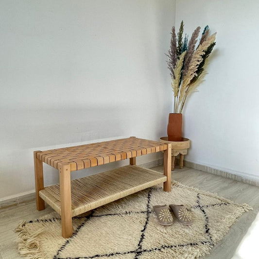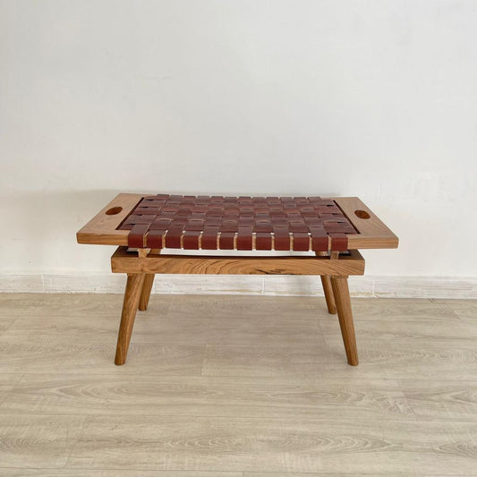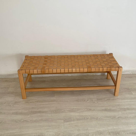 Teak Woven Leather, Benches Woven Leather Stool, Woven Natural, Leather Strap Bench, Saddle, -HANDMADE, Entryway bench, and of bed benchE